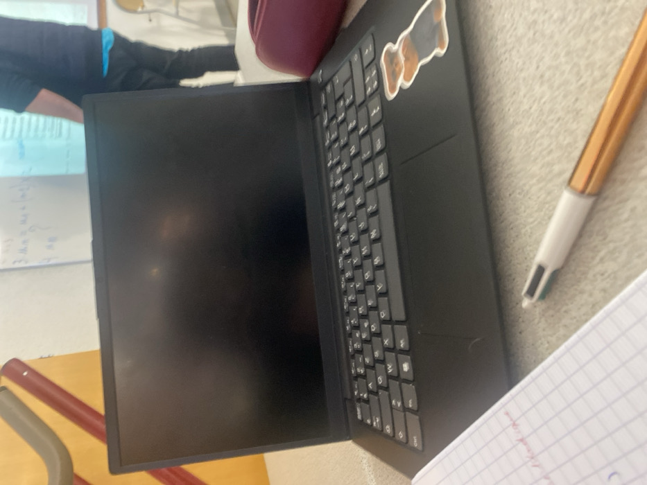 The image depicts an indoor scene in Schiltigheim, France, likely a classroom. In the foreground, a closed black laptop with a dark, reflective screen rests on a light-colored table. A sticker of a brown dog wearing blue overalls is affixed to the right side of the laptop's palm rest. To the left, an open white grid-lined notebook with faint red handwriting is partially visible. A multicolored pen, featuring a white barrel, metallic orange grip, and visible black, blue, red, and green ink sections, lies on the table. In the background, a person stands, partially obscured by the laptop, facing a white wall or projection screen. This individual wears a dark short-sleeved top, with a segment of bright blue fabric visible at their waist above dark trousers. The white surface displays faint handwritten text and a distinct blue rectangular projection. A yellow wall with two parallel reddish-brown bars is visible in the far left background, and part of a light-colored chair is visible behind the standing figure.