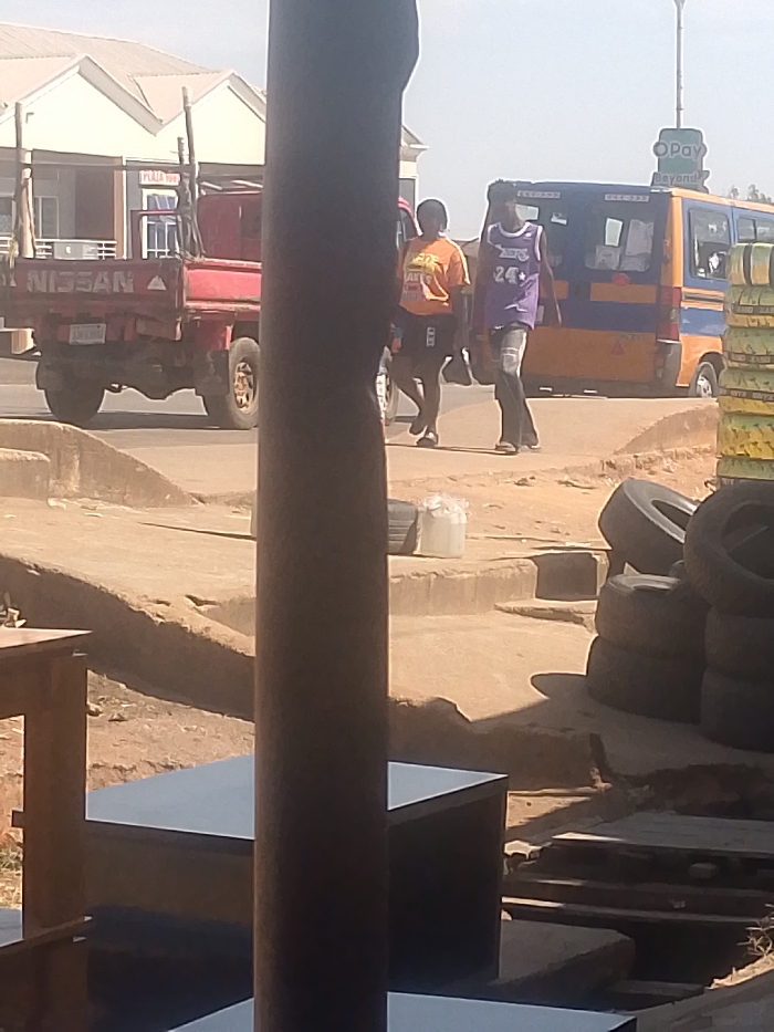 An urban street scene in Jos, Nigeria, is depicted on a bright, sunny day, partially obscured by a dark, cylindrical pillar in the foreground. In the immediate foreground, to the left, are dark, rectangular table-like structures. To the right of the pillar, a stack of worn vehicle tires rests on a dirt and concrete surface, near a white plastic container. The ground transitions from rough dirt and uneven concrete structures in the foreground to a paved road in the background. Two individuals are walking from left to right on a concrete pedestrian pathway in the midground. The person on the left is wearing an orange t-shirt with a white graphic and dark shorts, appearing to be a female. The person on the right, appearing to be a male, wears a purple basketball jersey with "24" printed in white, dark distressed trousers, and sandals. On the paved road in the background, a red Nissan flatbed truck is visible on the left, displaying "NISSAN" on its tailgate. Behind the pedestrians and to the right, a blue and yellow passenger minibus is present. Above the minibus, a green sign with "O Pay Beyond" and a logo is visible. A light-colored building with gabled roofs, partially obscured and displaying "PLAZA W..." on a sign, stands in the far background.