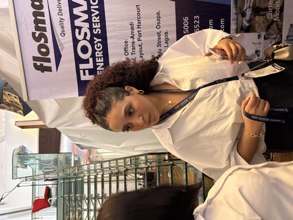 An indoor scene, likely an exhibition or conference hall, features a medium-shot of a woman interacting with another individual, partially visible. The setting includes a multi-level structure with glass railings and metal stairs in the background, where a red office chair is visible on an upper landing. White fabric draping is present behind the subjects, indicating event booth construction. The primary subject is a woman with light-to-medium skin tone and dark, curly hair pulled into a high ponytail. She wears a white collared shirt, dark trousers, gold hoop earrings, a gold ankh pendant necklace, and a gold chain bracelet on her left wrist. A dark blue lanyard with "SAIPEC" printed on it hangs around her neck, holding an identification badge. She is holding a light-colored smartphone in her right hand and carries a small, light-colored handbag with a patterned flap. Her gaze is directed slightly to her left, towards the partially visible second person, whose back of the head and left shoulder in a light-colored garment are visible on the left side of the frame. To the right of the primary subject, a large white and dark blue banner for "FLOSMART ENERGY SERVICES" is prominently displayed. Visible text includes "floSmart", "Quality Delivery", "FLOSMART ENERGY SERVICES", "Head Office:", "Trans-Amadi Layout, Port Harcourt", "Osapa, Lagos", phone numbers "5006", "6523", and a web address fragment "com". The lower right portion of the banner displays an image of industrial piping or infrastructure. The specific city of Itirin, Nigeria, as the location of this event, is not discernible from the provided image; however, the banner indicates operations in Port Harcourt and Lagos, Nigeria.