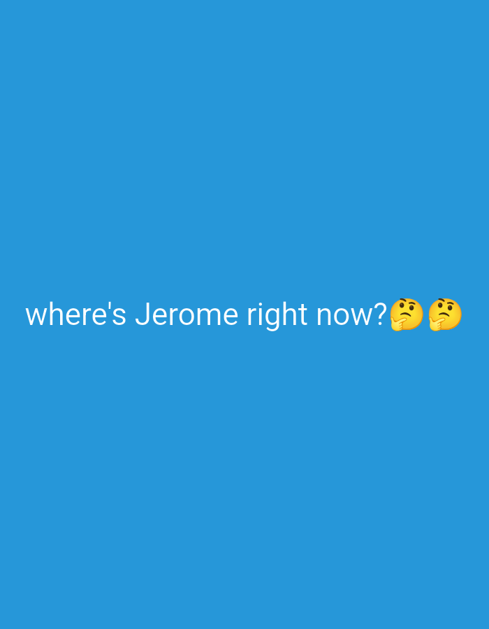 The image features a blue background with the text "where's Jerome right now?" written in white