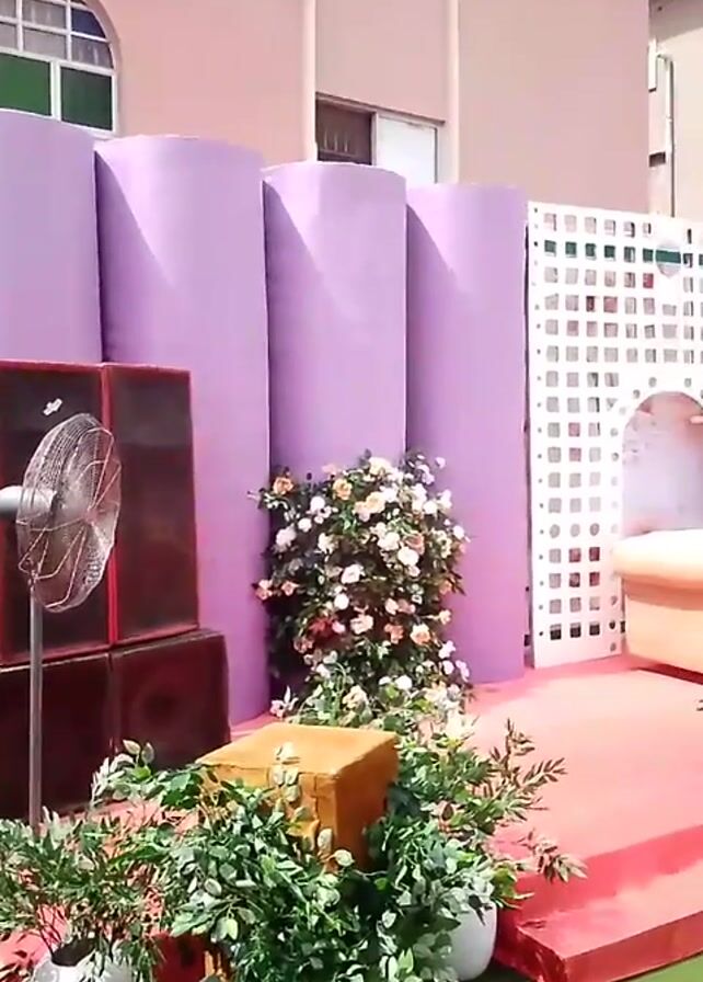n outdoor event setup. The primary colors are red, lavender, and green. A short stage with a red carpet and two low red steps has a beige couch as the centerpiece. Behind the couch is a white latticework wall with an arch cut out. Flanking the couch are arrangements of peach and white roses, wooden boxes, and planters with green foliage. Behind the stage are large lavender cylinders, and to the left are two speakers with a fan in front of them. The event appears to be taking place on a lawn in front of a pink two-story building. The camera pans slowly from left to right. There is loud music playing in the background.