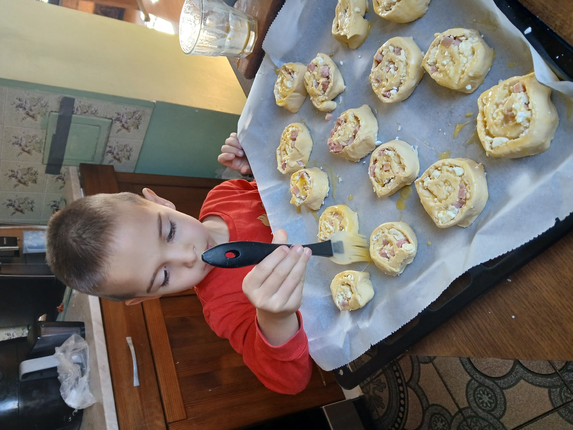 This image depicts a kitchen scene in Obrochishte, Bulgaria. A young, light-skinned child with short brown hair, wearing a red long-sleeved shirt, is actively basting pastry items. The child holds a black silicone basting brush in their right hand, applying a yellow liquid, consistent with egg wash, to a raw, spiral-shaped pastry roll. The primary subject is a dark baking sheet lined with white parchment paper, on which 18 individual raw pastry rolls are arranged. Each roll is composed of light-colored dough, spiraled around a visible filling of diced pink ham and crumbled white cheese. Several rolls exhibit a glossy yellow coating from the applied wash, while others appear untreated. The baking sheet rests on a light brown wooden tabletop. In the background, a kitchen environment is visible. To the upper left, a light-colored countertop holds a dark kitchen appliance, possibly an air fryer, and a crumpled clear plastic bag. Below the counter are wooden cabinets featuring a silver pull handle. The wall behind the countertop displays light green and patterned floral tiles. To the right of the baking sheet, a clear glass with some yellow liquid residue sits on a darker wooden surface.