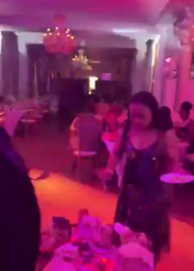 lively party, possibly a wedding reception, in a large hall with tables set for dining
