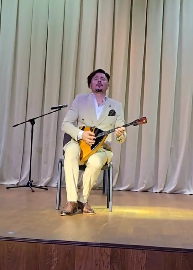 A man is playing the balalaika on stage. The man has dark hair and a mustache, and he is wearing a light beige suit. He is sitting on a chair, and a microphone is placed in front of him. The stage has a wooden floor and a backdrop of cream-colored curtains.