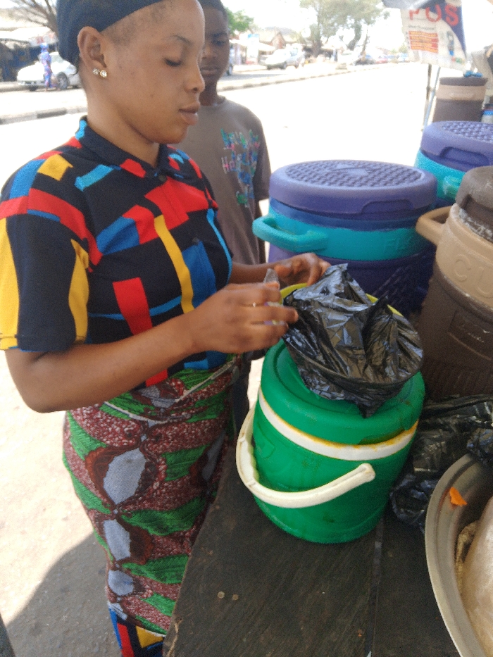 The image captures an outdoor street vending scene in Lokoja, Nigeria, under bright daylight