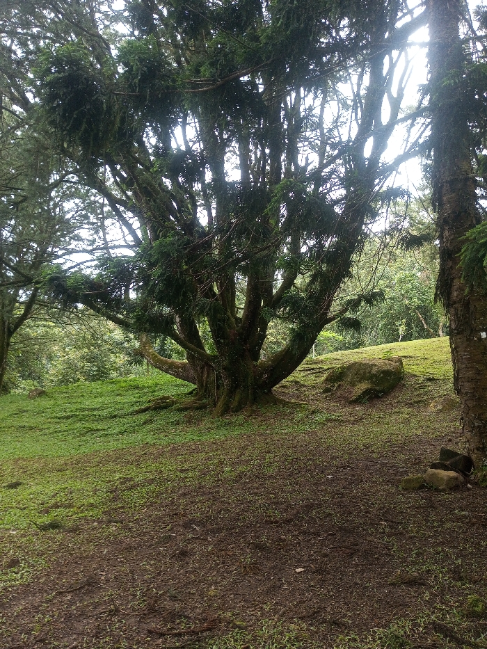 This image depicts a wooded area in Padegaon, India, under diffused natural light. The central focus is a large, mature tree with a thick, multi-branched trunk originating near ground level, extending upwards to a dense canopy of dark green foliage. The tree's bark and branches exhibit visible growth, consistent with moss or epiphytes. The ground immediately surrounding the central tree and extending into the foreground consists of dark brown soil with sparse patches of light green grass. Beyond this, the ground slopes upward, covered in denser green grass. To the right of the central tree, a large, moss-covered rock is situated on the sloping terrain. Further to the right, a narrower tree trunk with lighter, textured bark stands vertically. In the upper right quadrant, bright light penetrates the canopy, indicating the sky. The background shows a dense forest of varying green hues. No individuals or discernible human activity are present.