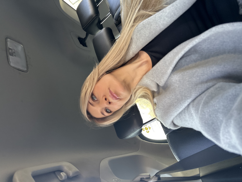 A blonde woman is depicted in a selfie taken from a low angle within the back seat of a vehicle