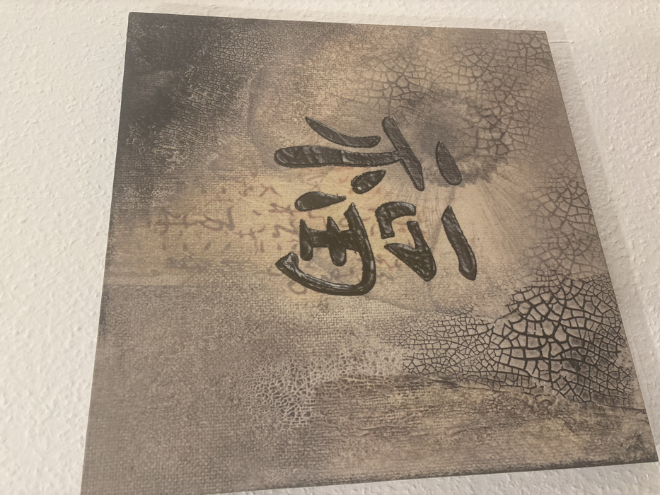 A square canvas hangs on a white wall. It features a textured, crackled background in shades of gray and beige, resembling aged stone or parchment. A bold, stylized dark-brown symbol, possibly a stylized Chinese or Japanese character, is centered on the canvas. Faint, smaller markings, reminiscent of ancient script, are visible behind the symbol, enhancing the aged aesthetic. The overall impression is that of an antique artifact or artwork.