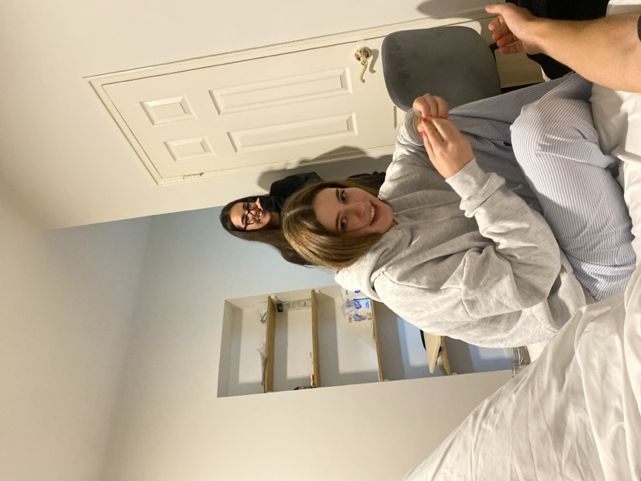 The image depicts an indoor scene within a residential dwelling, located in New York, United States. The precise address or borough is not discernible. Two young adult females are visible in a room with light-colored walls. In the foreground, a female with shoulder-length light brown hair, wearing a light gray hooded sweatshirt and blue and white striped pajama bottoms, sits on a bed with white bedding. She is facing slightly right, smiling with an open mouth, and looking towards the camera. Her hands are clasped in front of her, revealing red fingernail polish. A partial view of an arm, likely belonging to a third individual, is visible in the bottom right corner of the frame. In the mid-ground, behind and to the left of the foreground female, another female with long dark hair and eyeglasses stands, partially obscured. She is wearing a dark top, smiling, and has her left hand near her chin or mouth. To the left of the background female, a recessed shelving unit with four light wooden shelves is built into the wall. On the third shelf from the top, a roll of white paper (possibly paper towels) and a clear plastic bottle are visible. Other shelves contain indistinct items. To the right of the background female, a white panel door with a gold-colored doorknob is present. A dark gray upholstered chair is positioned in front of the door. The room is uniformly lit by an unseen artificial light source.