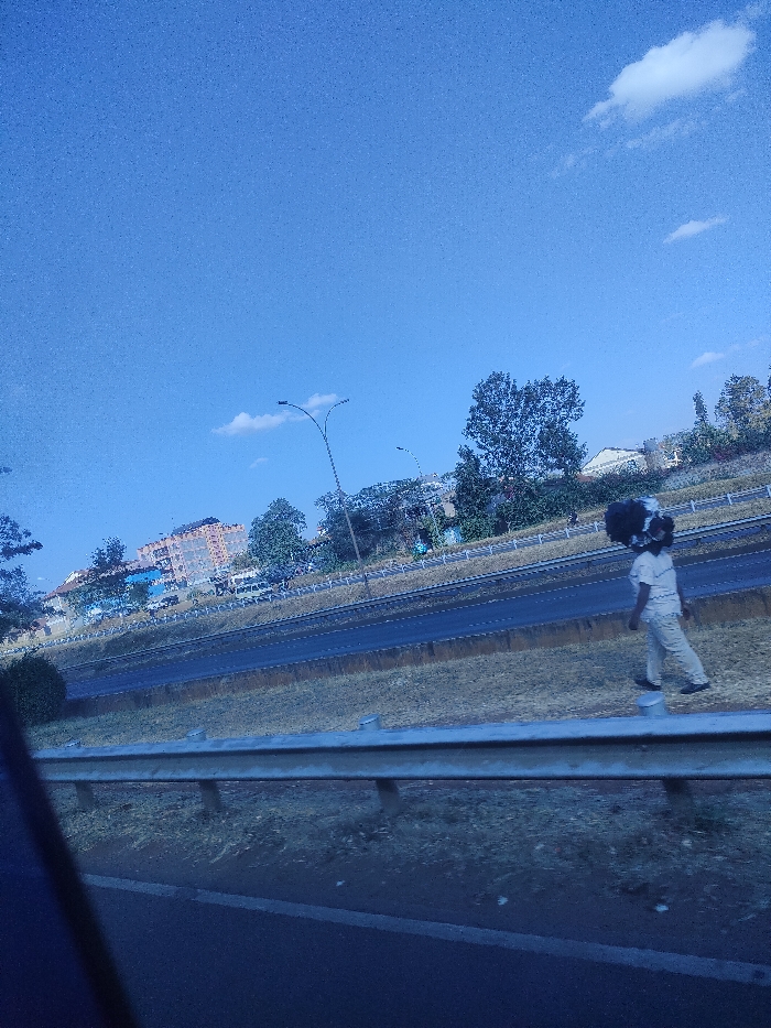 A man walks along a grassy median next to a highway, carrying a large black object on his head. He is wearing light-colored clothing. A guardrail is in the foreground. Beyond the highway, there are trees, buildings, and light posts. The sky is blue with a few clouds. The photo is taken from inside a moving vehicle.