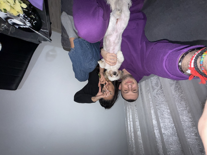 This image depicts an indoor scene in Varna, Bulgaria, featuring two individuals and a small dog on a grey sofa. A male subject, positioned on the left, is taking a selfie, holding the camera with his left arm, which is adorned with multiple bracelets. He wears a purple hooded sweatshirt and matching sweatpants, has short dark hair and a beard, and is smiling directly at the camera. In his lap, he holds a small, light-colored dog, likely a Shih Tzu, which faces forward. To the right of the male is a female subject with long dark hair, wearing a dark long-sleeved top and blue jeans, with grey socks visible on her feet. She is posing with her hands forming a rectangular frame over her face, looking through her fingers towards the camera. The background consists of a plain white wall, with patterned light-colored curtains partially visible behind the male. To the far right, a dark table holds a black plate containing food remnants (potatoes with greens and a white sauce), a fork, and a glass. A black upholstered chair is partially visible next to the table.