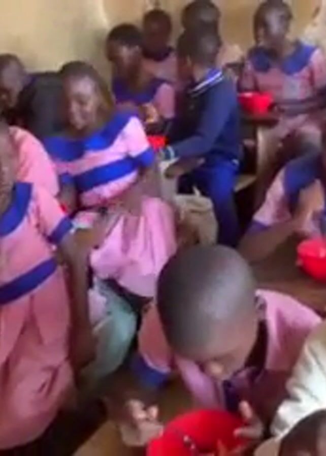 classroom of children, mostly girls, sitting at desks and eating from red bowls