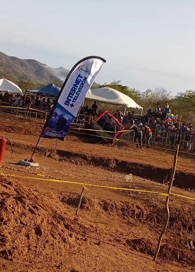 n off-road vehicle flipping onto its side at a race or event. The red roll cage of the vehicle is visible as it tumbles in a dug-out dirt track. A person in dark clothing is running next to the flipping vehicle. In the background, there is a crowd of spectators behind a fence, several tents, and mountains in the distance. A banner with the words "Internet + Television" on it stands near the track. Yellow caution tape is strung along the edge of the track. The ground is muddy and uneven.
