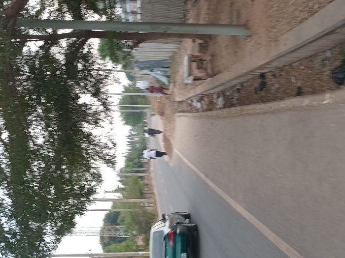 A road stretches into the distance, bordered by a concrete drainage ditch and fence on one side and a tree on the other. Two people are walking along the side of the road, while a car is driving towards the camera on the road. Tall poles line the side of the road in the distance.