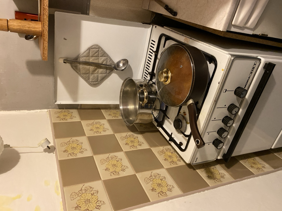 This image depicts a corner of a kitchen located in Opava, Czechia. The central subject is a white, freestanding Mora 210 T gas stove, positioned against a tiled wall to the left and a plain wall to the right. The stove's white metal back panel is in an upright position. On the stovetop, two of the four burners are active. A stainless steel pot containing water is situated on the rear left burner, with a blue gas flame visible beneath it. On the front right burner, a dark-colored pot with a transparent glass lid and a brass-colored knob contains a reddish-brown substance, likely food, with visible condensation on the lid. A dark brown handle extends from this pot towards the viewer. The stove's front panel features five black control knobs. The tiled backsplash on the left wall consists of a checkerboard pattern of solid beige and light yellow square tiles, with the yellow tiles featuring a brown floral design. Above the tiles, the wall is a light, discolored yellow with visible stains or peeling paint. A white electrical outlet or light fixture with exposed wiring is mounted high on this wall. The wall to the right of the stove is painted a uniform grey. Affixed to the upright back panel of the stove are a quilted, light-colored pot holder and a metal ladle hanging from a hook. To the immediate right of the stove, a light-colored countertop is visible, upon which two knives with dark handles are placed. A small, light-colored wooden shelf is partially visible in the upper right corner, holding indistinct items. No individuals are present in the scene.
