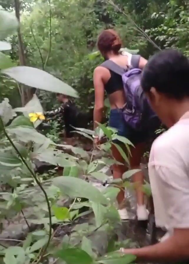 A group of four people, dressed in casual clothes, are walking through a forest. They are walking over a stream. The camera is behind the group, and slightly to the right. The woman in front has a purple backpack on. The environment is dense and green.