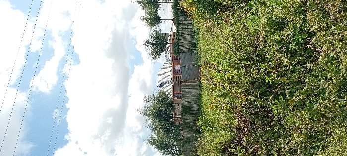 The scene depicts a rural or semi-rural landscape in Gatakaine, Kenya, under a partially cloudy sky. In the foreground, dense, green, unkempt vegetation, comprising various bushes and weeds, covers the lower half of the frame. Directly behind this vegetation, a rough wooden fence constructed from vertical, irregular planks or logs runs horizontally across the midground. Behind the fence, a single-story structure, likely a house, is visible. The structure appears to be under construction or renovation, featuring walls of light-colored wood and a roof partially covered with corrugated metal sheeting. Several slender trees with green foliage are positioned along the fence line and around the house. In the upper portion of the image, multiple thin, dark, dotted lines, consistent with overhead power lines, traverse the sky diagonally against a backdrop of white and grey cumulus clouds interspersed with patches of light blue sky. No individuals or overt actions are discernible within the frame.