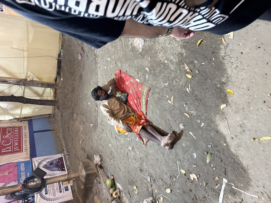 The image presents an unpaved outdoor scene in Bidhannagar, India, under artificial lighting. An adult male, appearing to be of South Asian ethnicity, is centrally positioned, lying on his left side on a red, patterned mat directly on the dirt ground. He has dark hair and a beard, and is wearing a light brown, long-sleeved garment and an orange lower garment, barefoot. His left arm is bent, supporting his head, while his right arm rests across his torso. A small, dark bundle is visible beneath his left arm. His gaze is directed towards the viewer. The ground around him is scattered with dry leaves, plastic straws, and other debris. To the immediate left, a concrete utility pole features coiled black cables and an attached electrical box. At the base of this pole, several green coconuts and refuse are present. In the mid-background, two banners are visible: an upper white banner displaying "B.C. Sen JEWELLERS" and "TRUSTED SINCE 1888," and a lower blue and white banner with Bengali text and an architectural illustration. Further back, a light-colored fabric or tarp structure forms the background, with a slender tree trunk positioned in front of it. In the immediate foreground, on the right side of the frame, the partial view of another individual's right arm and torso is visible; this person wears a black short-sleeved shirt with white lettering and a bracelet on their right wrist.