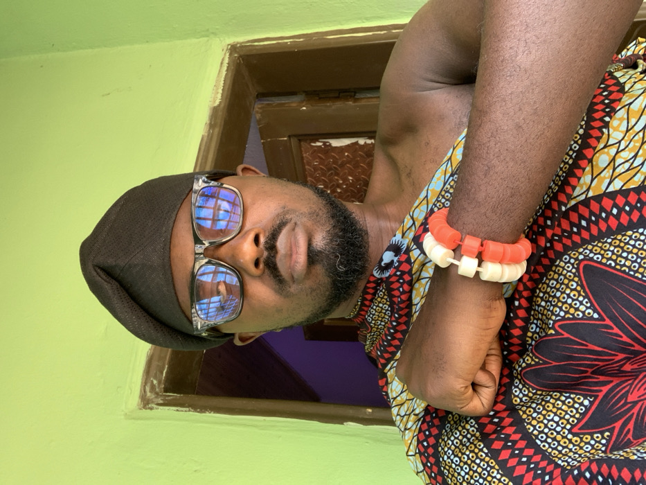This image presents a close-up, chest-up portrait of an adult male located in Barakin Akawo, Nigeria. The subject has a medium skin tone, a trimmed beard and mustache, and is looking directly forward. He wears black-framed glasses, in which a bright reflection is visible. A black, woven cap covers his head. His torso is partially draped in a vibrant, patterned fabric, likely a traditional West African textile, featuring red, yellow, black, and light blue geometric and floral motifs. His right shoulder and upper chest are bare. On his right wrist, he wears two bracelets composed of disc-shaped beads, one with off-white beads and one with orange beads. His right hand is clenched into a fist and rests against the draped fabric on his chest. The background consists of a bright lime green wall. To the subject's right, a brown wooden door frame is visible, with a dark opening revealing a textured, possibly metallic or embossed, surface of a door or interior space beyond. The lighting is bright and even.