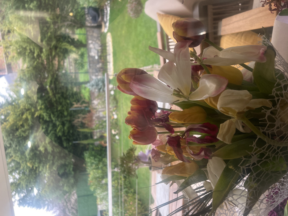 This image depicts an indoor scene looking out through a large window onto a garden area in Markovo, Bulgaria. In the immediate foreground, occupying the lower half of the frame, is a multi-colored floral arrangement, predominantly consisting of tulips. The flowers show signs of wilting, with many petals drooping, crumpled, or partially detached. Observed colors include red, orange, yellow, white, and dark pink/magenta. Green foliage is interspersed within the bouquet, which is partially wrapped in a white, open-weave mesh material. The bouquet rests on a light-colored surface, possibly a table or windowsill. Reflections of two circular interior light fixtures are visible on the window glass, superimposed on the outdoor view. A segment of a yellow cushion and a wooden furniture frame, possibly part of an outdoor seating arrangement, are partially visible through the window on the far right. Beyond the window, a well-maintained green lawn extends into the mid-ground. A horizontal metal railing, characteristic of a balcony or terrace, is visible traversing the mid-section of the outdoor view. A low stone wall forms a boundary across the garden. The background features a dense collection of evergreen trees and shrubs. A green mesh fence is discernable behind the trees on the left. In the far right background on the lawn, a dark, irregularly shaped object, possibly an outdoor sculpture or chair, is present. No individuals are visible in the scene. The lighting suggests ambient daylight conditions, potentially overcast.