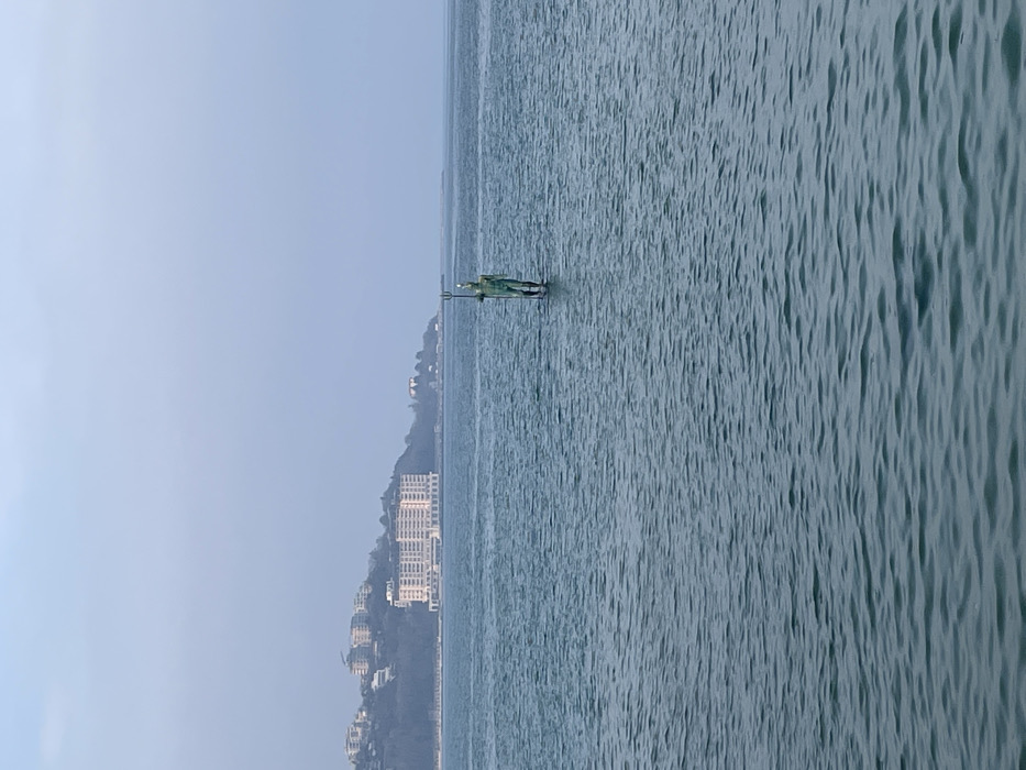 A verdigris-patinated bronze statue of a male figure, identified as Poseidon/Neptune holding a trident in his right hand, stands partially submerged in the calm, dark blue-green waters of the Black Sea. The water level reaches approximately the statue's upper thighs. A small, light-colored bird is perched atop the statue's head. The water's surface exhibits subtle ripples. In the mid-ground, the distant coastline of Varna, Bulgaria, is visible under a hazy, pale blue-grey sky. A prominent, multi-story, light-colored building complex with numerous windows is situated on the lower part of a tree-covered hillside near the shore. Additional residential structures are scattered further up the vegetated slope. The scene is illuminated by diffused, even light, suggesting overcast conditions or atmospheric haze.