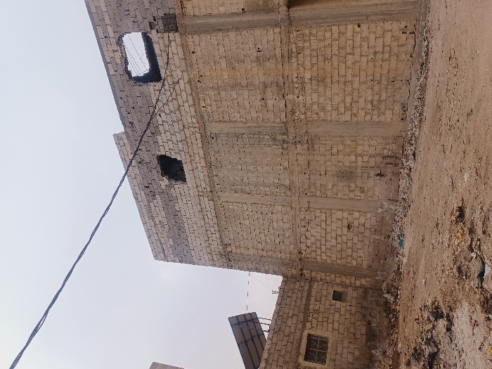 The image displays an outdoor scene in Kafr Sousa Municipality, Syria, under an overcast sky. The central feature is a partially constructed or damaged multi-story building, composed primarily of light brown concrete blocks with vertical grey concrete structural elements. The upper portion of this building exhibits two large, irregularly shaped openings or holes, and its top edge appears uneven. Black utility cables traverse diagonally across the upper frame, passing in front of the main structure. To the left, a lower building, also constructed from concrete blocks, features a small window with a grid pattern and solar panels mounted on its roof. The ground in the foreground is unpaved, consisting of dirt and scattered debris, including construction waste. No individuals are present, and no actions or interactions are depicted.