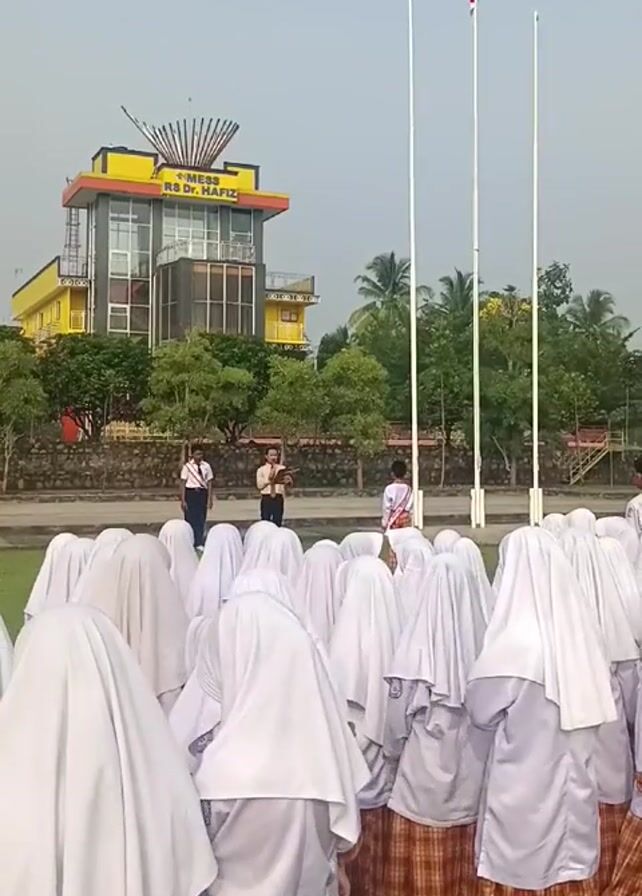 group of female students wearing white hijabs and brown plaid skirts standing in a grassy field, facing three flagpoles in the distance, only one of which has a flag attached. Behind them, three adult figures stand, one of whom appears to be speaking to the students. In the background, there is a yellow and gray building with the words "MESS RS Dr. HAFIZ" on it, trees, and a stone wall. The sky is overcast.