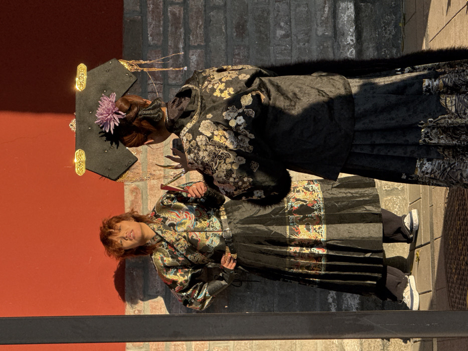 Two people pose outdoors in traditional Chinese clothing. One wears a black headdress with a purple flower and a black robe with gold floral patterns. The other wears a dragon-patterned jacket and a black pleated skirt. They are on a sidewalk, with a red wall and brick buildings in the background. Both are wearing modern sneakers.