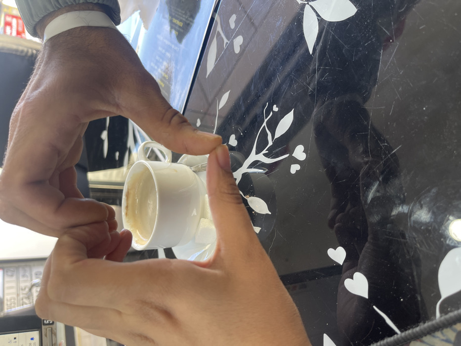 The image displays two human hands, one on the left with a lighter skin tone and one on the right with a more robust appearance and visible wristband, positioned to form a heart shape. Centered within this heart is a white ceramic coffee cup, approximately two-thirds full of espresso topped with crema, resting on a matching white saucer. Two white sugar cubes and a metallic spoon handle are present on the saucer. This arrangement is set upon a black, reflective table surface patterned with white floral and heart designs, showing multiple surface scratches. In the blurred background, a menu displaying multi-language text, including "ESPAÑOL," is visible on the right, next to a partially visible digital display with numerical figures. The scene is located within an indoor café environment in Meknes, Morocco.