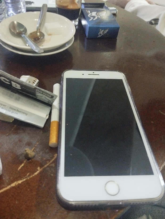 The image presents a close-up, overhead view of a dark brown wooden table surface in an indoor establishment in Tangier, Morocco. A clear glass of water is partially visible in the upper left. Below it, two stacked white ceramic saucers hold two small metal spoons and a single white sugar cube. To the right, a glass containing a dark beverage, consistent with espresso, is positioned next to a blue cigarette pack adorned with a silver winged emblem. A silver disposable lighter rests on or near a packet of OCB rolling papers. A single unlit cigarette with an orange filter is placed vertically on the table. Adjacent to the cigarette, a small, dark brown, irregular lump, consistent with cannabis resin, is visible on the tabletop. Dominating the foreground is a white smartphone, appearing to be an iPhone model, encased in a clear protective cover with its screen dark and reflective. A blurred white fabric, suggestive of clothing or a limb, is partially discernible in the background to the right.