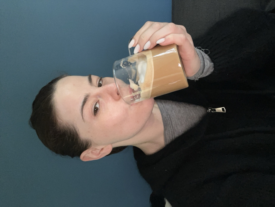 - "A female subject, with dark hair pulled back, is depicted in a medium shot, drinking from a clear glass mug" by FM-2aYl13, licensed under CC BY 4.0