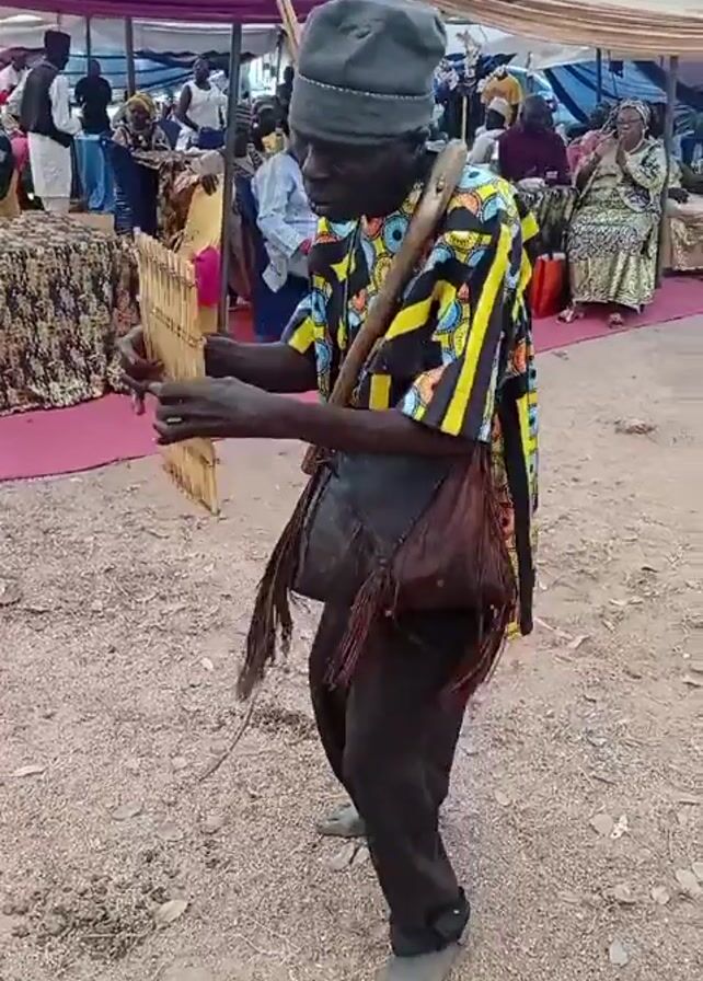 man playing a traditional instrument, likely a type of xylophone or lamellophone made from bamboo. He is dark-skinned, wearing a grey hat, a brightly patterned shirt, dark pants, and is barefoot. He has a leather bag slung across his body and a wooden staff tucked into the strap. He is standing on a dirt ground. In the background, there are people seated under a large tent-like structure, suggesting an event or gathering. The tent has a pink carpet at its entrance and is decorated with fabrics. Tables are set up with decorations. The overall atmosphere suggests an outdoor celebration. The music provides a festive and cultural vibe.