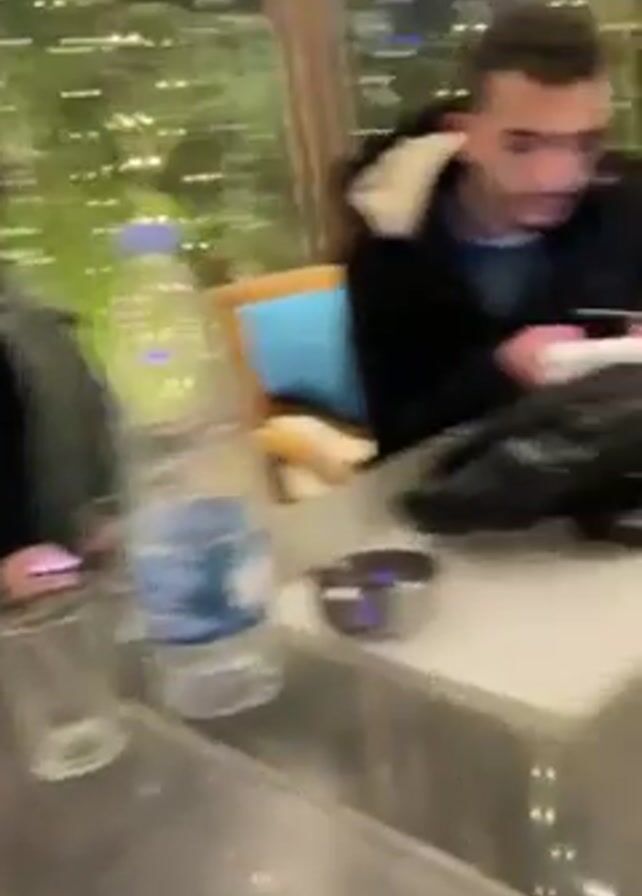 Two young men sit at a table outside under hanging lights. One wears a light hoodie and glasses and looks at his phone, sometimes holding his head in his hand. The other wears a dark jacket with a fur-lined hood and looks at his phone. There is a small ashtray with napkins on the table between them, along with a napkin dispenser, a bottle of water, and a glass. The camera moves slightly and the people briefly look around.