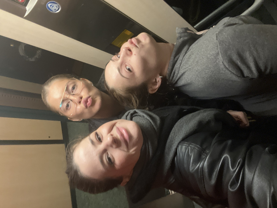 Three women pose for a selfie inside a vehicle, possibly a train. The woman on the left wears glasses and makes a puckered face. The woman in the middle wears a gray hooded sweatshirt. The woman on the right smiles and wears a black leather jacket over a gray hooded sweatshirt. The background features a dark panel with a silver circular emblem and beige vertical panels. The photo appears to be taken in low light.