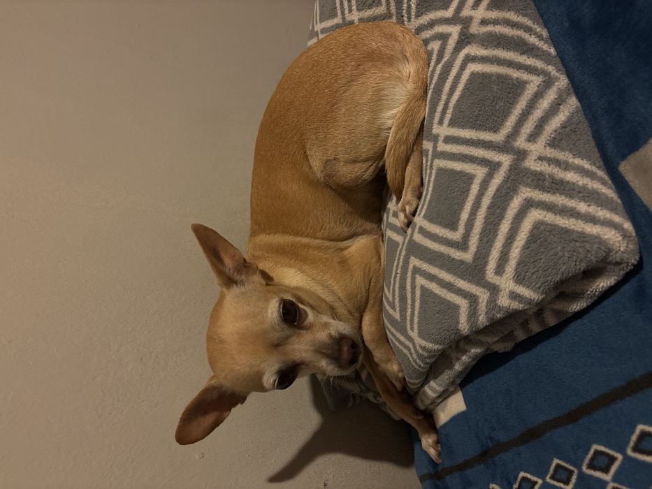 - "The image depicts a small, tan-colored dog, resembling a Chihuahua, resting indoors in San Juan Cuautlancingo, Mexico" by FM-wgZuV2, licensed under CC BY 4.0