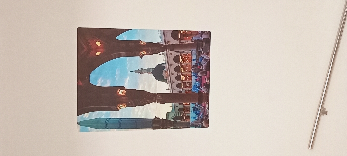 A photograph mounted on a plain, light-colored wall displays an exterior view of the Al-Qarawiyyin Mosque in Fez, Morocco