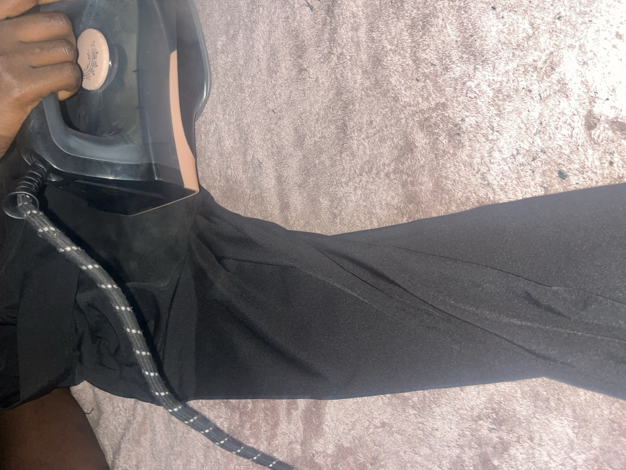 person ironing a pair of black pants on top of a light pink fabric, possibly a towel or blanket. The person's hand is visible holding the iron. The iron cord is black and white. The setting is indoors with a light source from above. The location is not discernible from the image and therefore cannot be specified as Dadi Riba, Nigeria.