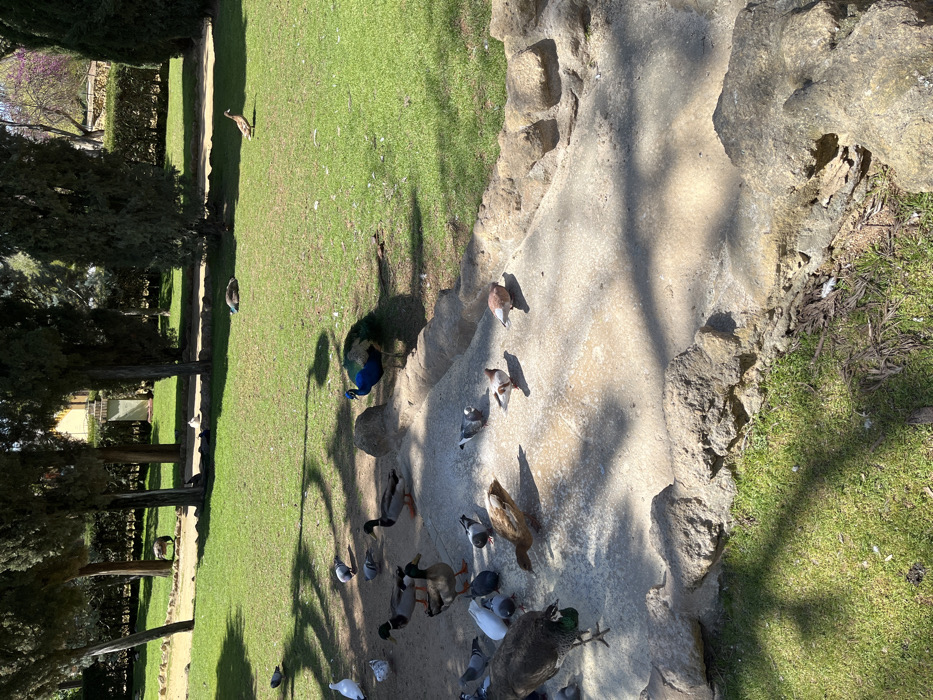 The image captures a park scene in Dos Hermanas, Spain, under bright daylight with dappled shadows. The foreground features a dry, shallow, light-colored concrete basin or stream bed with irregular, rough stone borders. Multiple avian species are present on this concrete surface and the adjacent green grass. Identified birds include: - **Peafowl:** At least three individuals. One vibrant blue-green male peacock stands on the grass to the right of the concrete basin. A darker-feathered peahen walks on the concrete towards the lower-left corner. Another lighter brown peahen rests on the grass in the mid-ground, further back. A fourth peafowl, likely a peahen, is partially visible resting on the grass in the distant mid-ground. - **Ducks:** Approximately five ducks are visible, primarily dark brown or grey, positioned on or at the edge of the concrete basin. Some exhibit orange feet. - **Pigeons:** Numerous pigeons, displaying various grey, white, and brown plumage patterns, are scattered across the concrete and the surrounding grass. - **Other birds:** One smaller, light brown bird with a lighter underside is actively foraging on the concrete in the central foreground. The environment consists of a well-maintained green lawn, bordered by several mature, tall coniferous trees and other deciduous trees in the background. A light-colored building or structure is partially visible through the trees in the far background. No human individuals are observed.