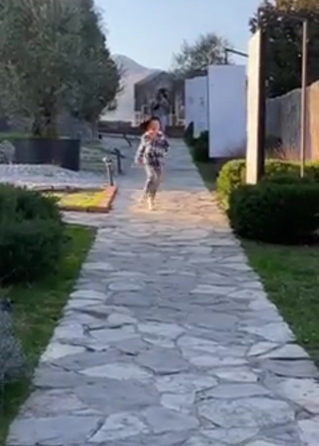 A young boy runs towards the camera along a winding stone path in an outdoor setting