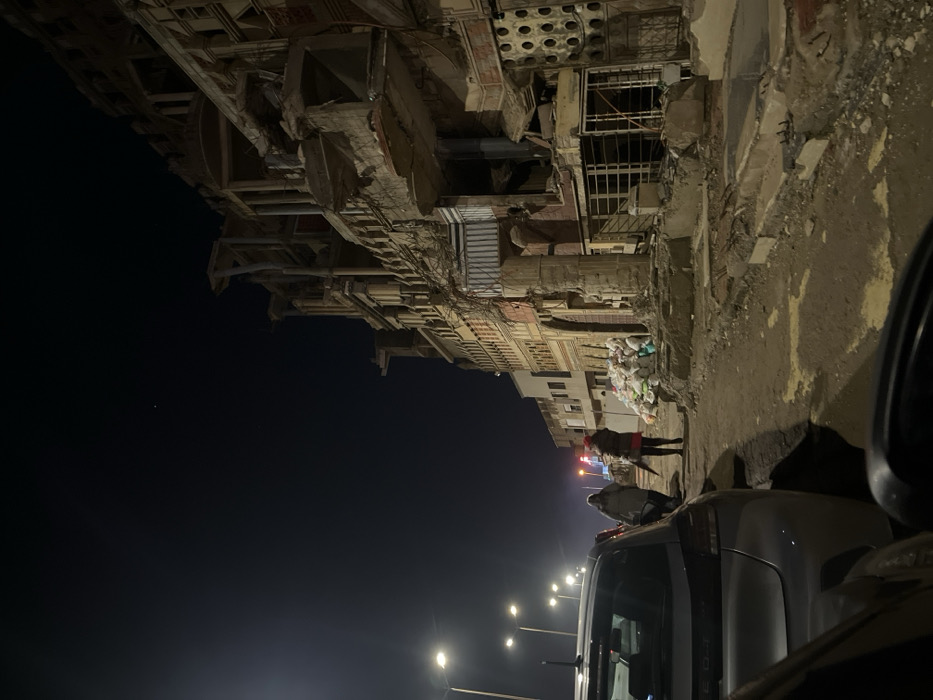 An angled view captures a dilapidated building at night. The structure reveals exposed interiors and crumbling facades, suggesting damage or disrepair. Two people stand on the dimly lit sidewalk beside a white van, streetlights lining the road behind them. The scene evokes a sense of urban decay or a neighborhood in need of restoration. The dark sky contrasts with the bright lights, emphasizing the scene's dramatic atmosphere.