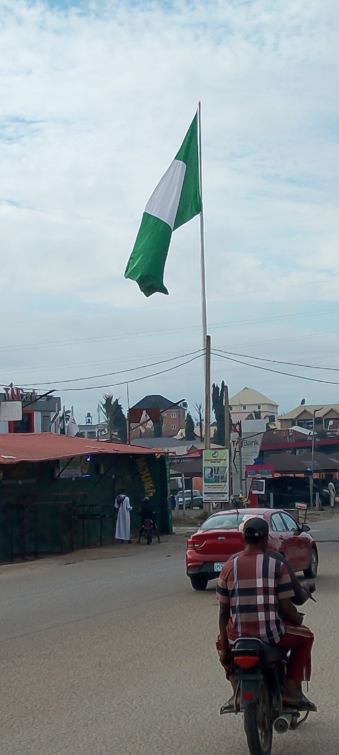 The image depicts an urban street scene in Kubwa, Nigeria, under a mostly cloudy sky. A large Nigerian flag (green-white-green) is displayed on a tall pole, unfurled and gently blowing, prominently positioned towards the upper right. On the asphalt road in the foreground, a dark motorcycle is moving away from the viewer, carrying two male occupants; the driver wears a plaid shirt and a dark cap. Immediately behind the motorcycle, a red sedan, possibly a Kia, is visible. To the left of the road, a green-painted commercial structure with a reddish-brown corrugated metal roof is present, bearing a partially visible 'MOUKA' sign. Two individuals stand near this structure: one is dressed in a long white traditional robe, appearing to interact with a second person who is standing beside a parked motorcycle. To the right, a building features a visible 'TAJ Bank' sign, positioned near a wooden utility pole from which multiple power lines extend across the frame. Various multi-story buildings with different roof types and scattered vegetation comprise the mid-ground and background elements under the overcast conditions.