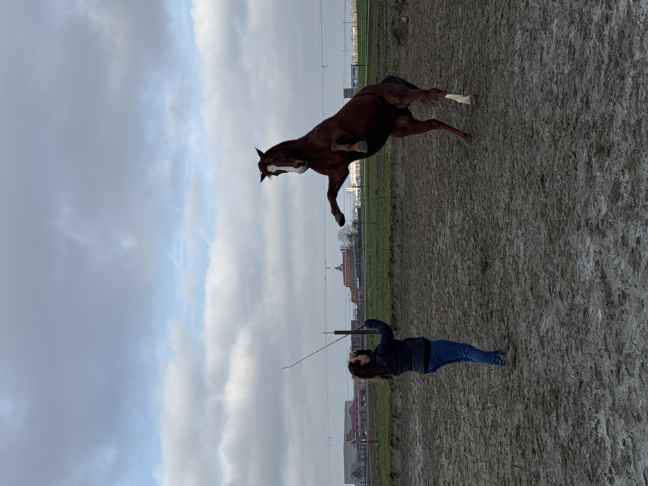 The scene unfolds outdoors in Estaimpuis, Belgium, on a heavily churned, muddy ground surface under an overcast sky with visible cloud formations and faint contrails. An adult female, with dark hair, wearing a dark jacket and blue jeans, is positioned with her back partially to the camera, facing a bay horse. She holds a dark, approximately 1.5-meter long training whip or stick with both hands, pointed towards the horse. The bay horse, identifiable by a prominent white blaze on its face and a white sock on its right hind leg, is captured rearing on its hind legs, with its front legs lifted and bent. A wire fence separates the immediate muddy area from a grassy field in the mid-ground. The background reveals distant buildings, consistent with light industrial or agricultural structures, and scattered trees.