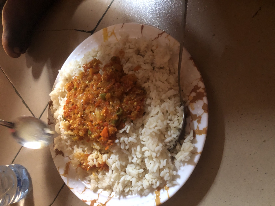 An overhead shot captured in Dutsinma B, Nigeria, depicts a meal served on a light-colored, patterned plate resting on a tiled surface. The plate contains a substantial portion of white rice, topped with a smaller, central mound of reddish-orange stew composed of finely chopped vegetables, including visible red and green peppers, and onions. A metal spoon is positioned horizontally on the right side of the plate, partially embedded in the rice. Another metal spoon is observed from above, centered at the top of the frame, appearing in motion over the food, suggesting an ongoing act of serving or eating. In the upper left background, a clear plastic bottle of water is visible. The upper right background reveals the partial view of a human foot on the tiled floor, indicating the presence of an individual near the meal. The ambient lighting suggests an indoor setting.