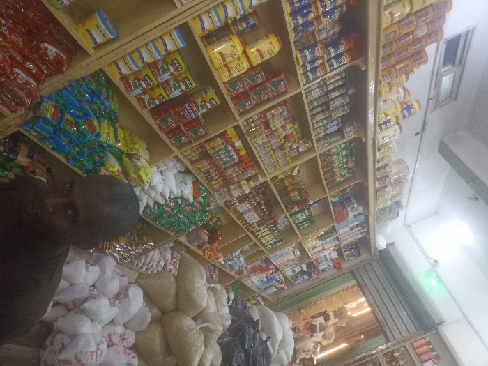 The image depicts the interior of a retail establishment, likely a provision store or market, situated in the city of Dutsinma A, Nigeria