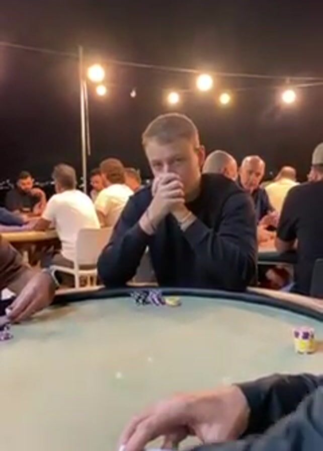 A poker game is taking place outdoors at night. Several players are seated around a green poker table, illuminated by string lights overhead. The dealer is distributing cards. One man in a black long-sleeved shirt is centered in the frame, looking at the dealer with a slight smile as he receives his cards. He has short, light hair and his hands are clasped in front of his face. Other players sit around the table, partially visible. The background shows additional tables with people, set against the dark sky.
