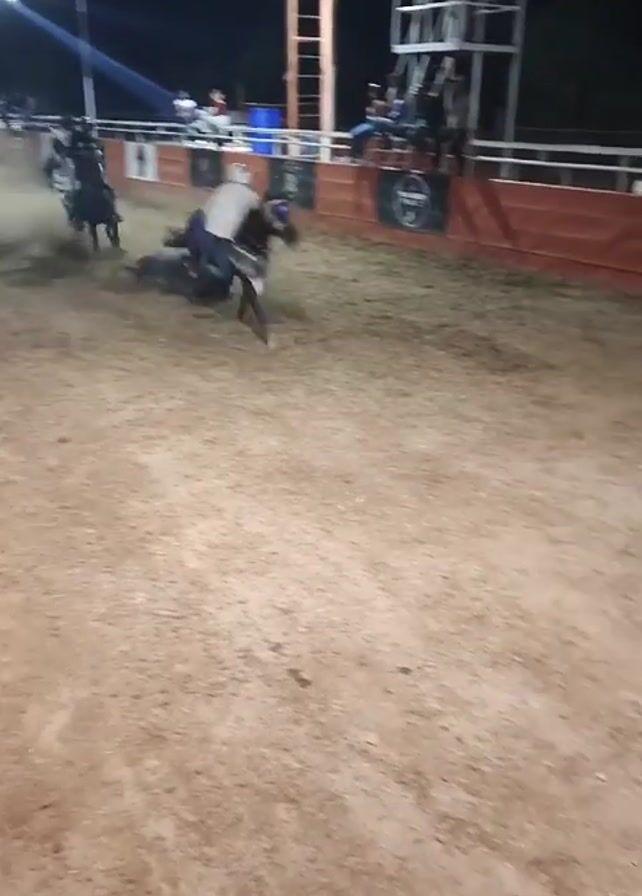 bullfighting event at night. A bull is being chased by multiple mounted horsemen. The bull falls to the ground multiple times, as the horsemen maneuver around it. The arena is fenced with a reddish barrier with sponsor logos. Above the fence, spectators watch from a raised platform and the surrounding area. The arena is lit by artificial lights, and the surface is a dirt ground.