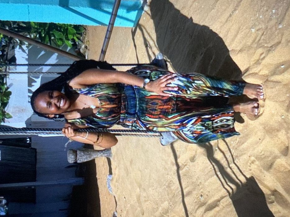 A woman with braided hair, wearing a colorful dress and several bracelets, sits on a rope swing over sand