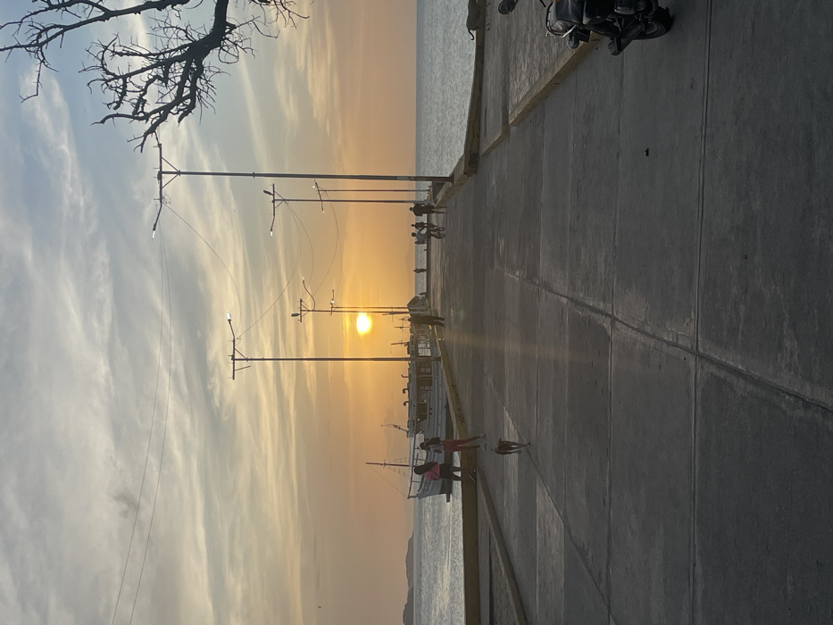 This image depicts a sunset over a concrete pier in Juan Griego, Venezuela, extending into a calm body of water. The setting sun, a prominent orange-yellow orb, is low on the horizon, casting a warm glow across a partly cloudy sky. Along the pier, multiple streetlights with LED-style fixtures are visible, some appearing illuminated. On the left side of the pier, two white boats are moored. Two individuals are standing near the pier's edge next to the boats: one female in a light-colored top and dark pants, and another female in a pink top and dark pants. Distant landmasses are visible on the horizon to the left. On the right side of the pier in the foreground, the dark, gnarled branches of a bare tree are partially visible, and a dark-colored motorcycle is parked. Further down the pier, several human figures are silhouetted against the sunset, with at least two individuals appearing to be on bicycles. A light-brown, medium-sized dog is running towards the viewer in the foreground, slightly left of the pier's center.