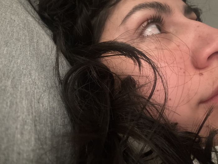A close-up, low-angle shot features a woman's face resting on a gray pillow. Her dark, curly hair is tousled around her face. She gazes upwards, her eye visible. Her skin appears fair with a few freckles. Part of her nose and lips are visible on the right. The background is indistinct, with the focus primarily on the woman's features and hair. The lighting is soft and natural.