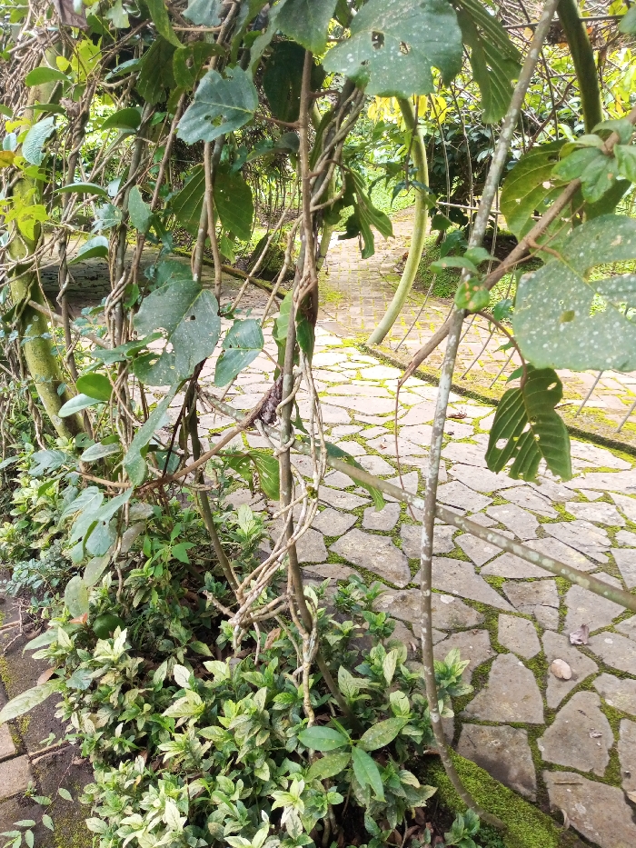 The image depicts a verdant garden or natural pathway in Kanand, India. The foreground is dominated by a dense arrangement of green foliage, including small-leafed ground cover, variegated plants, and numerous intertwining vines and slender woody stems. Broad green leaves, some exhibiting insect damage with irregular holes, are prominent. A metal wire fence or trellis structure is partially visible, integrated with the climbing vegetation. In the midground, a pathway composed of irregularly shaped, light grey flagstones or concrete pavers is visible, with patches of green moss growing in the seams. To the right of the pathway, a long, pale green, elongated fruit or vegetable, consistent with a bottle gourd, hangs vertically. The background consists of blurred green foliage, suggesting a continuous garden or park environment. No people, animals, specific actions, or interactions are present in the scene. The area is illuminated by natural daylight.